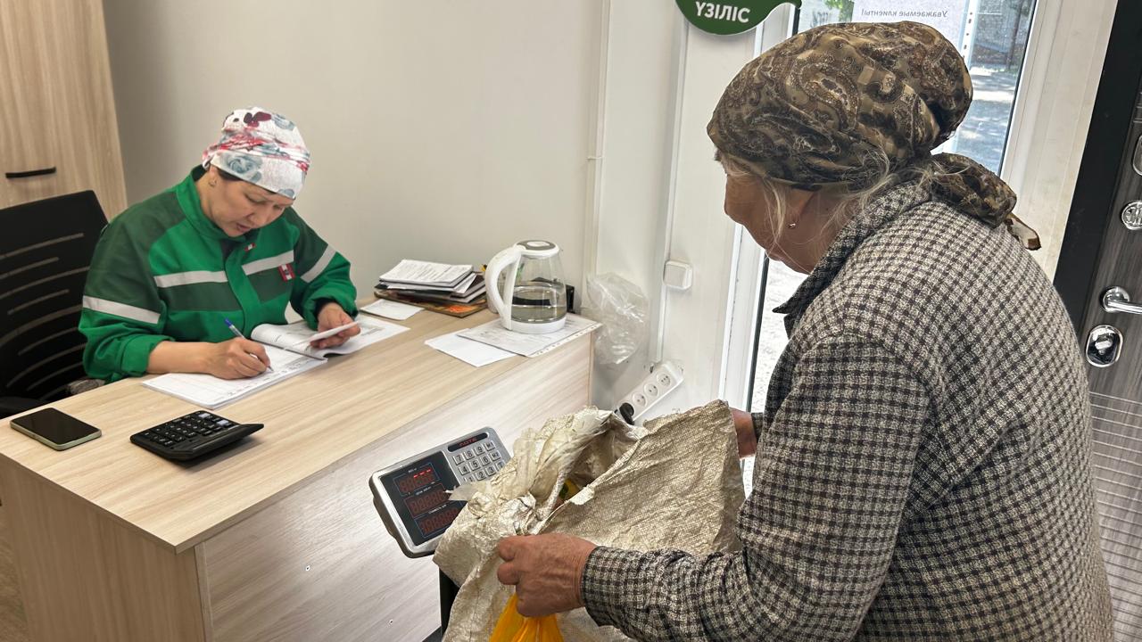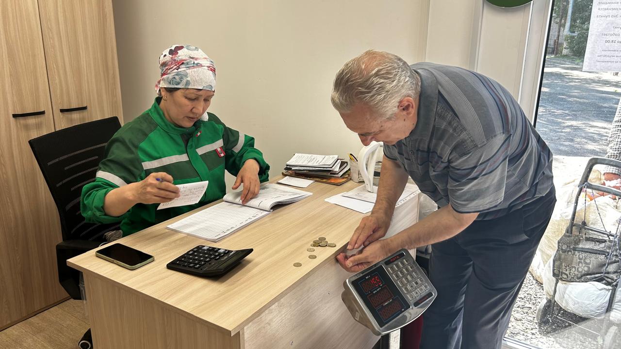 Приёмщица Акуштап Ахметжанова работает в первом открывшемся экопункте с декабря 2024 года и говорит, что с утра до обеда приняла двадцать человек.