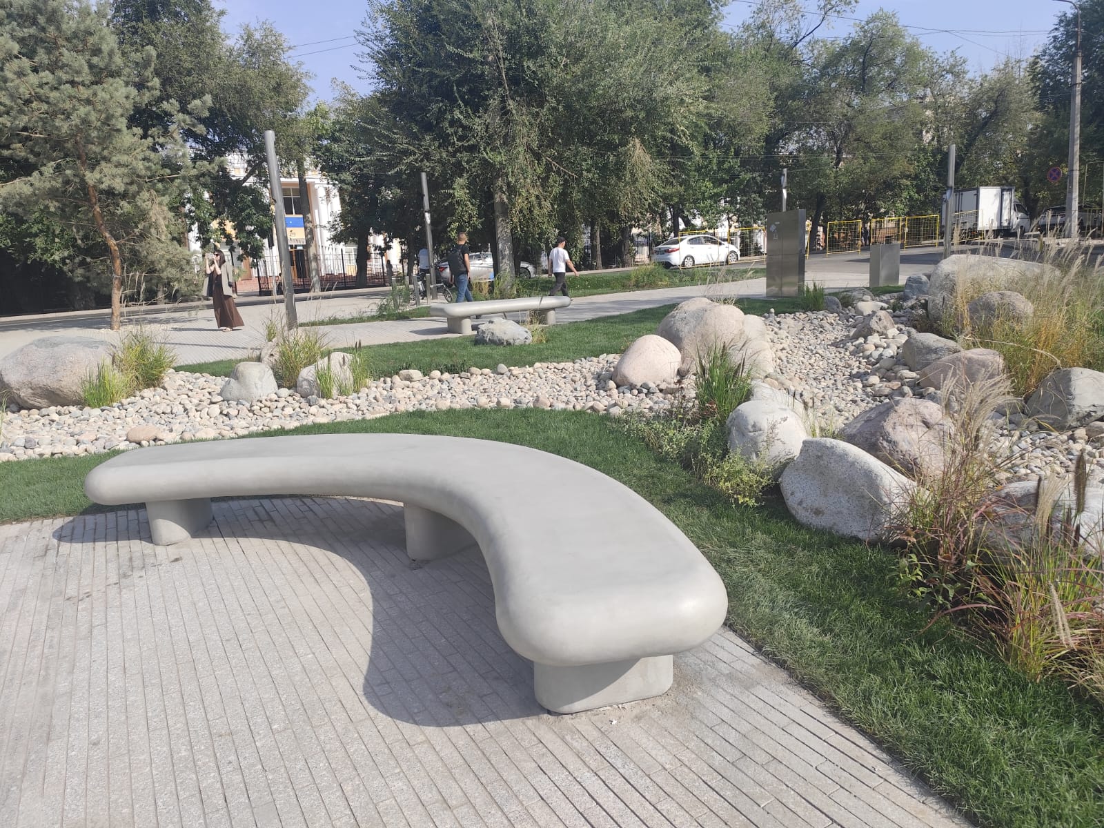 Территорию перед центром благоустроили. Рядом со зданием появилась сухая речка, выложенная из камней и "протекающая" среди ковыля. Вдоль её берегов установили необычные скамейки.