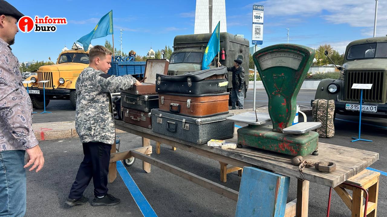 Затем организаторы начали разгружать и раскладывать экспонаты, которые как минимум полвека назад активно применялись в быту. Такие чемоданы и весы для взвешивания товаров хорошо помнят бабушки и дедушки молодых казахстанцев.