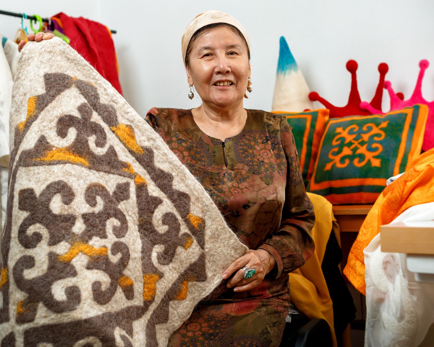 "Это ремесло было полностью забыто. Со словом "войлок" у всех перед глазами всплывали ассоциации с толстой кошмой, которой укрывали юрту или стелили на землю вместо пола. В лучшем случае вспоминали войлочные ковры – сырмаки и текеметы, которые наши бабушки делали ещё в ХХ веке. Мы с сестрёнкой тоже в приданое от своей бабушки получили по одному сырмаку и алаша", – рассказала предпринимательница.